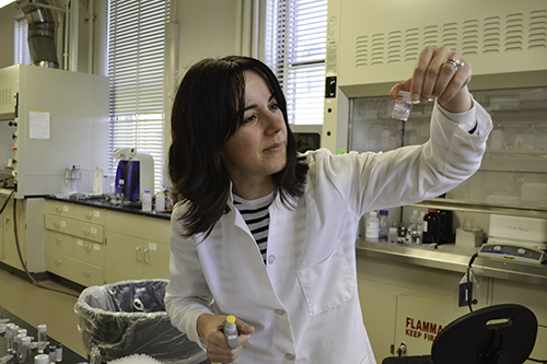 Leal discusses the properties of one of the materials she's researching.