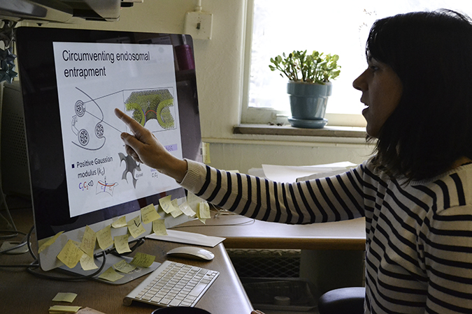 While some research on campus uses real viruses as a delivery system, Leal doesn't, but uses materials that emulate viral properties. She takes materials similar to those in cell membranes, then makes “materials or particles that are pretty much like a virus; they can contain DNA inside,” she explains, “and the idea is to use these materials or these nanoparticles to go from the outside of the cell to the inside of the cell and deliver cargo.” These nanoparticles could be designed to respond to a certain stimulus—an increase in temperature or a magnetic or electric field—by opening up to release cargo. “In essence, you could say this is nano-machine that we are operating from the outside.”