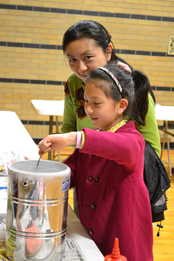 MechSE’s education coordinator, Joe Muskin, and Xander Hazel from the Orpheum Children’s Science Museum in Champaign, also led students in a hands-on activity making mirrors. In addition, local 4H members provided a station where visitors could make, then “launch” their own stomp rockets. Leal teachers held an egg drop contest; plus the Rube-Goldberg machines the school’s 5th graders made were also exhibited and demonstrated at Science Night.