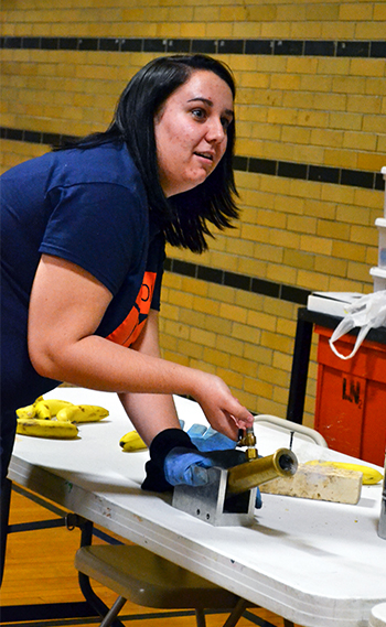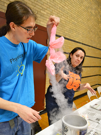 One such undergraduate student group was Physics Van, a student-run organization whose members did fun activities with liquid nitrogen. For example, they shot a cork from a miniature cannon, hammered a nail into a board using a liquid-nitrogen-flash-frozen banana, and demonstrated its effect on gasses, like oxygen, by dipping a balloon animal into liquid nitrogen to make shrivel, then expand when exposed to air temperature. Sophomore Taylor Sabatini, the group’s current coordinator, participated in Science Night. She says she tries to go to as many of the Van’s outreach activities as she can. Her motive for doing outreach is “getting through to young kids. I think it's important to get kids, especially girls, excited about science at a very young age.”