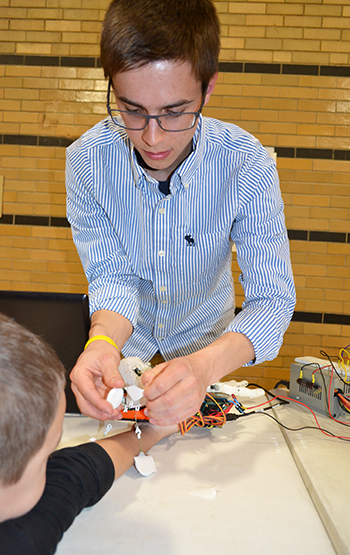 Another undergraduate student who participated was Patrick Slade, who demonstrated bionic prosthetics, including one he designed. He attached the prosthesis sensors to the arms of young volunteers so the youngster were able to control the prosthesis using the muscles in their forearms.