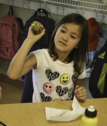 In the second lesson, the students learned about the spread of the black plague which decimated the population across Europe during medieval times. Then the MCBees did a fun activity to illustrate how easily germs can still be spread today. Prior to coming, the MCBees had, without the students' knowledge, previously coated some of the objects being used in the first lesson with glow powder to simulate for the youngsters how easily a disease can be spread by touch. Livesey then used a black light to show them all the "germs" on their hands.