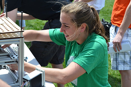ME370 student Natalie D'Agostino makes adjustments to their mechanism.