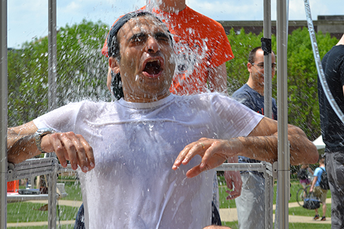 In the aftermath of a drenching, MechSE Professor Sameh Tawfick, one of the instructors for ME370, celebrates a team's success.