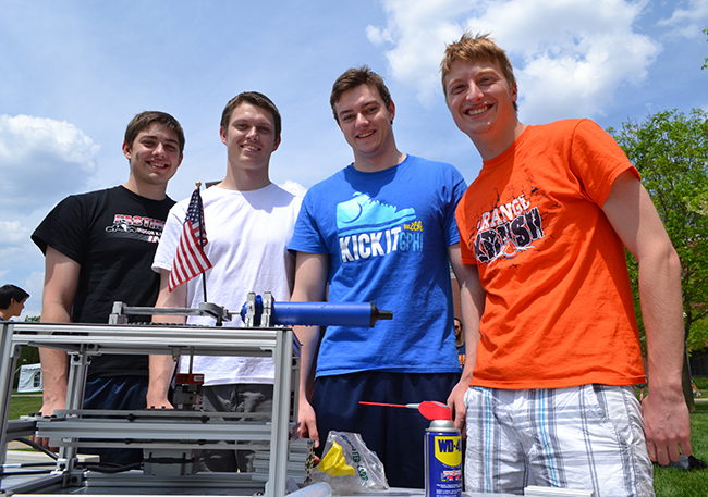 ME 370 students John Guidone, Alex Gray, Steve Wuthrich, and Patrick Klein, display their mechanism which allowed them to successfully drench their Professor, Sam Tawfick, and win the contest.