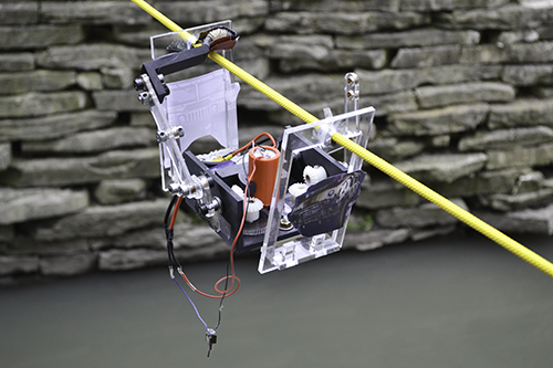 To test students’ skills acquired over the semester, plus to add some zest to an oftentimes tedious round of final exams, MechSE Assistant Professors Sameh Tawfick, Arend van der Zande, and Professor Emeritus Darrell Socie came up with a final competition for the Spring 2017 edition of ME370, Mechanical Design I, that was a bit more unique than last year’s, which involved building a robot that navigated in a fashion similar to Star Wars’ Imperial Walkers. For this year’s competition, robots were to traverse a rope strung across Boneyard Creek as quickly as possible, without stalling, requiring assistance or a restart (which would get points deducted), or worst-case scenario, getting a dunking in the creek.