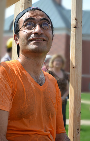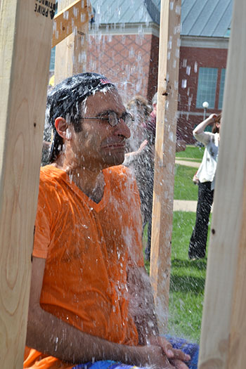 The assembled crowd of interested onlookers was a hodge-podge comprised of ME 370 students, plus, no doubt, random, curious students who saw a crowd gathering, thought it looked like fun, and stopped to watch. Even Mechanical Science and Engineering staff, faculty, and administration showed up. For example, Bob Coverdill was there, most likely to proudly watch the students succeed; MechSE department head, Placid Ferreira arrived near the end, just in time to see Hsiao-Wecksler and her son get drenched. Also attending were a smattering of other professors, who dropped by to watch colleagues get drenched, and of course, the intrepid ME 370 professors, who were soon to deliver on their promise to risk all in the drenching booth.