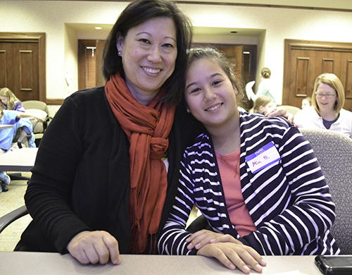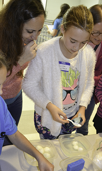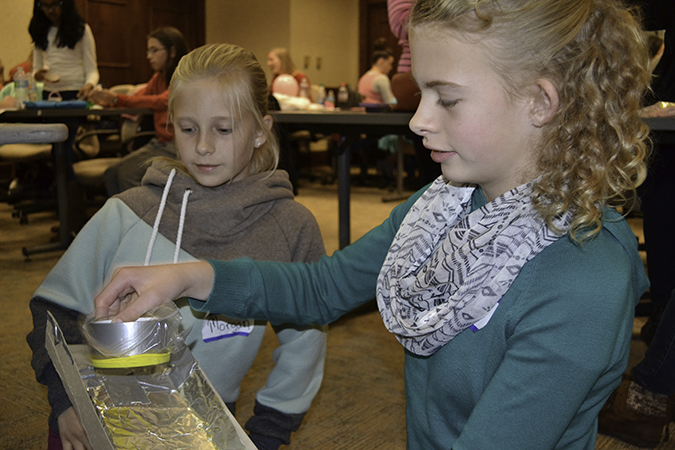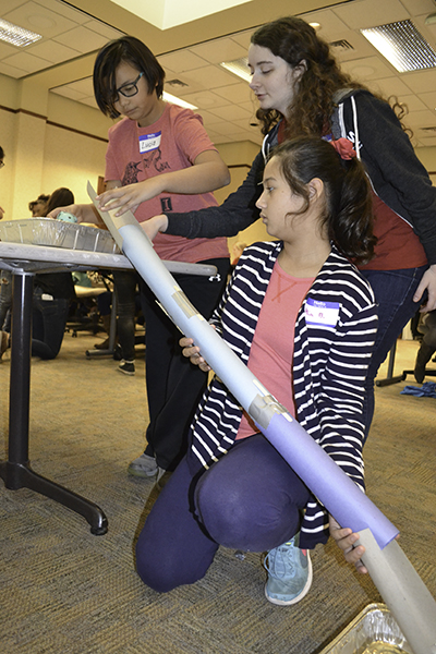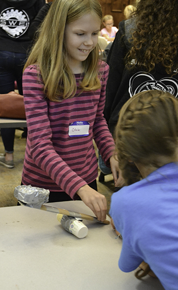 Mia wasn’t the only middle schooler who had the potential to blossom into an engineer. SWE’s Co-Outreach Coordinator Abbie Gerth believes there were several future engineers among the youngsters, and loved that the moms were enjoying it too. “That’s one of the coolest things about this event,” she acknowledges, “is that you get to see the moms learn alongside with their daughters. It’s really a bonding experience for them and it’s something really cool to see as a volunteer for this event. We hope that they’ll continue following their passions.”