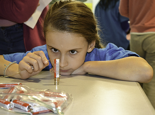 According to SWE Co-Outreach Coordinator Abbie Gerth, this activity appeared to be one of the kids’ favorites. “They really enjoyed the mechanical engineering activity,” Gerth says, “which was a sling shot in the form of a lever. So they really liked learning about levers and making the see-saw sling shot—especially getting to fling the ping pong balls. So that one was definitely a hit. That one we’ll keep on doing.”