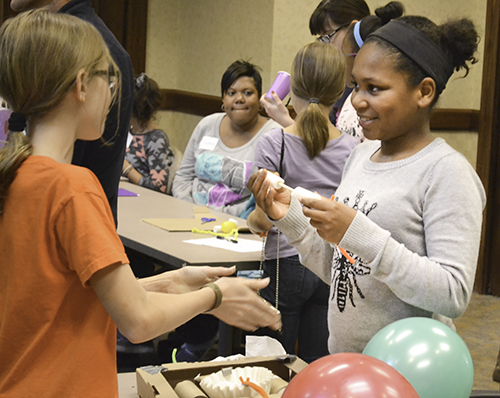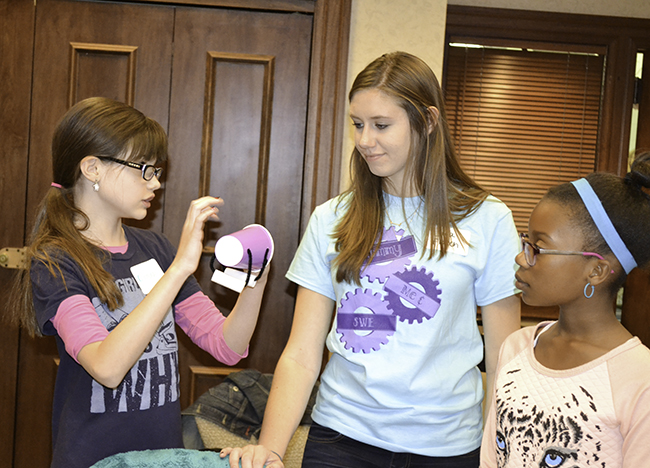 One highlight of the day's activities consisted of an interactive round robin, where participants visited eight different stations, each representing an engineering discipline at Illinois. There the girls participated in a variety of hands-on activities designed to give them a taste of what each discipline is about. "Manning" the stations were female engineering students studying those fields who guided the girls in how to do the activity, asked questions designed to get the girls to think, plus served as role models.