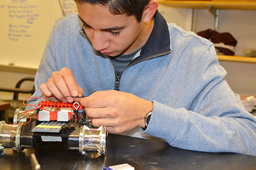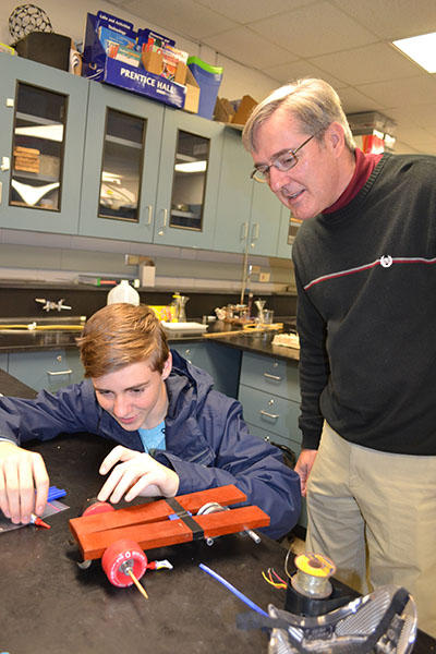 For December, with its finals and then Christmas break, students were assigned a make-your-own-design project. They received an electric motor, a switch, and some wire, plus they had access to boxes of Connects, Legos, balsa wood, and other materials—“just little bits and pieces of a lot of stuff I've picked up over the years,” Koker adds. The idea was that they just build something. It could be a car or something else, but it had to use a motor, batteries, and have a switch. His instructions were, “See if you can get something that’s useful and works,” then just kind of left it open ended.