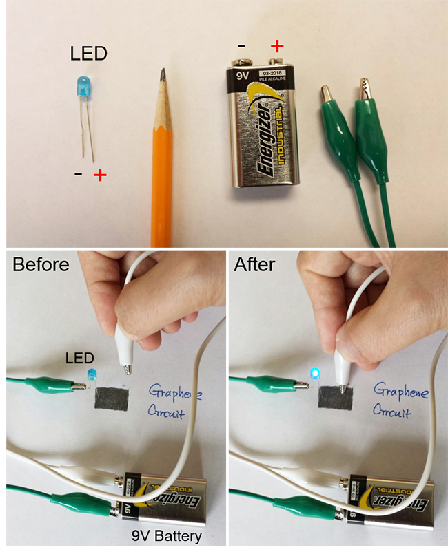 Students draw a structure on a piece of paper, then place a 9-volt battery at one end and an LED light bulb at the other. The electrons move from the battery following the graphene pathway across the sheet of paper to light up the LED. For even more fun, and to demonstrate graphene’s flexibility, he has students crumple the paper, and the circuit still works!