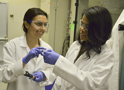 Left to right: Nikou Pishevaresfahani and her graduate student mentor discuss her research in Dr. Yi Lu's lab. What did she discover about research? Calling the REU her “first professional research experience," she says she’s learned that: “Everything has to be controlled,” and that “You have to keep redoing tests just to get significant results to make sure they’re reproducible.”