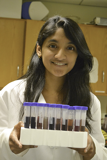 nano@illinois REU participant Rumya Raghavan displays samples of gold nanoparticles she worked with while doing research in Professor Rohit Bhargava's lab.One rising junior who especially appreciated the SROP seminars was Rumya Raghavan, a Bioengineering major at MIT. She says they were "really valuable in helping me structure my CV and resume, and to learn how to do deliver poster presentations." She also called them helpful for "discovering different ways in which people network."