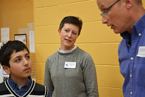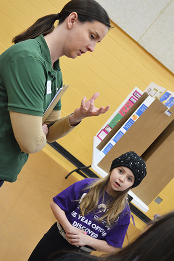 Stacey Clements, the Champaign County Forest Preserve's Education Program Specialist, discusses their science fair project with a couple of NGS students.