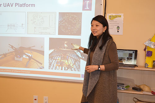 Sharing with the girls about her work with GPS and drones was Aerospace Engineering Assistant Professor Grace Gao. Passionate about increasing the number of women in STEM and especially in her field, Gao shared an anecdote about when she was an undergrad and one of the few women in studying her field and had felt it necessary to downplay the fact that she was female. To encourage the girls that things are changing in engineering, and that they can be engineers and still be girls, Gao shared with them a list of some of her many roles and interests, most of which are traditionally enjoyed by women.