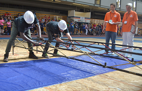 Other scoring categories included weight, display, efficiency, economy, and stiffness. While schools do have some leeway in terms of what grade of steel they want to use and the exact kind of bridge they want to build, it does have to be made of steel. Kurumoglu did not think that it would be too beneficial to change the grade of steel, because each kind has its advantages and drawbacks. For instance, he commended the durability of the 904L, but said that it was harder to work with than the 316L, which is basically common stainless steel. The bridges are subjected to a lateral load test to measure stiffness, wherein the bridge cannot deflect past a certain point or the team gets penalized. They also undergo a vertical load test in which the bridge has to hold 2500 pounds. For the economy score, judges made an economic calculation based on the building time, and construction and maintenance costs, as well as an analysis of the costs and benefits of the project.