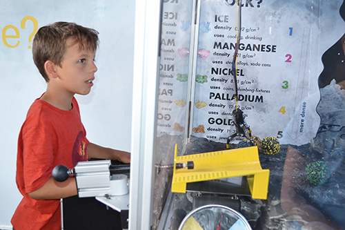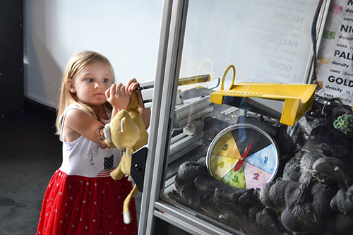 So Brauer and his staff came up with several ideas for exhibits they’d like, and the two student teams chose the ones they were interested in. One, the Asteroid Mine, gives young visitors a chance to mine “asteroid rocks,”picking them up using a giant gripper. After placing it on the scale, they are then to use the chart to determine what kind of ore they've picked up, then send it back into the pile of ore samples.