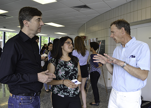 Left to right: Joe Muskin and Jessica Perez listen as Uni High science teacher, David Bergandine, explains his heat pipes curriculum during POETS’ 2017 High School Student Research Symposium.For example, at Illinois and Arkansas, teachers focus solely on curricular development. After being introduced to POETS and its research, they then focus on developing a product. Stanford’s program, however, is a traditional RET: embedded into a research lab, teachers are trained in laboratory safety, do experiments, analyze data, and give a poster presentation summarizing their research. But they also get together with the other teachers to design a curriculum around what they learned.