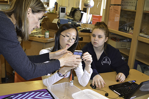Sharlene Denos (left) works with two Uni High students on their solar car design as part of a POETS RET curriculum module.Another module about solar cars was tested in two local schools this past spring: at Uni High in Sharlene Denos’ class, and in Bryant Fritz’s class at Next Generation School (see istem article). Then this past summer, both returning and new POETS’ RET teachers worked to refine the 2016 modules and add new material to the multi-module unit.