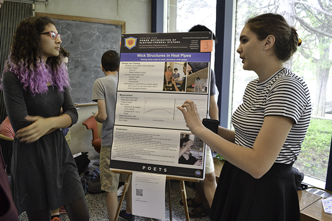 A Uni High student presents her team's research on heat pipes during POETS’ 2017 High School Student Research Symposium.To do a test run on the curriculum developed so far, in spring 2017, teachers from Illinois’ 2016 RET team tested the curricula they had written with their students. For example, David Bergandine’s chemistry students at Uni High did research projects testing twelve different variables about heat pipes. While gaining general knowledge related to heat flow and heat transfer, and some in-depth knowledge about the specific area they researched, students not only learned what research is like, but got to present their research at POETS’ 2017 High School Student Research Symposium (see istem article).