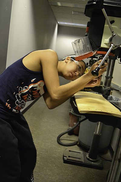 An engineering student in ENG 198 uses a drill press on her team's project. First-Year Design Course on Personal Mobility. POETS’ engineering design course, ENG 198, piloted in fall 2016, is designed to give freshmen a chance to discover what it’s like to be an engineer early on. Working as part of an interdisciplinary team, they are to come up with an innovation of benefit to society in the area of personal mobility. The goal is for students to learn the engineering process, experience teamwork, and come up with an end product that lets them experience having contributed to society.