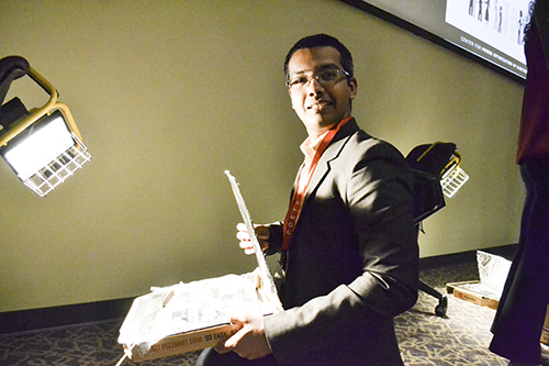 A POETS graduate student places the pizza box solar oven he and his teammates created in an optimal spot for "baking" during a 2017 workshop on outreach for POETS grad students.Another way students get to know each other is via webinars. “They share their research; they teach people about a research topic in terms of an overview,” says Perez