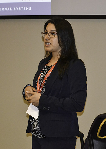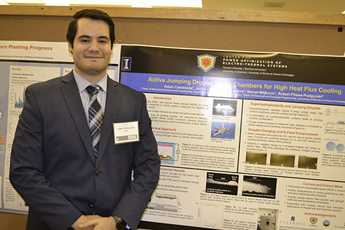 Adam Castaneda presents his research at the Illinois Summer Research Symposium. Ever wish your electronic devices were faster and more powerful? As part of the 10-week Research Experience for Undergraduates (REU) sponsored by the POETS (Power Optimization for Electro-Thermal Systems) Engineering Research Center, four undergraduate students had an opportunity this past summer to learn more about this issue. Their goal was to not only participate in current research to put more power into less space in our electrical technologies, but possibly help do something about it.