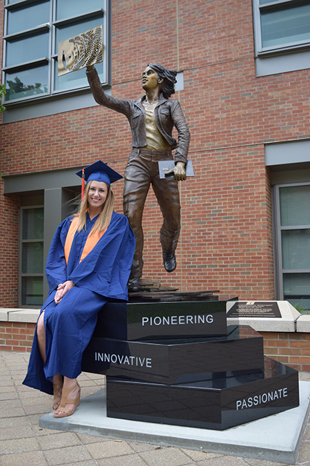 “The student committee helped drive the vision of how she would appear,” Wolters says. “The fact that she is wearing pants vs. a skirt. What she's doing: she's is in motion. You'll see that she's crafted from the bottom up. There are some circuit boards and books that form from her leg; it's like her base of knowledge. That's her past knowledge, her base, and it forms her into the person that she currently is. And she's reaching forward to the future, creating from her finger tips on a plasma screen, where she's creating the future. So her foundation builds her up to then create the future. That was part of the sentiment that came from our discussions with the committee, and then the artist.”