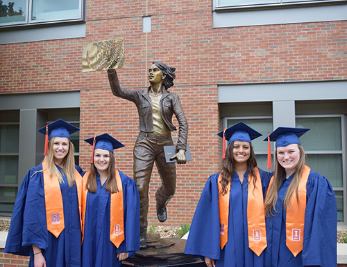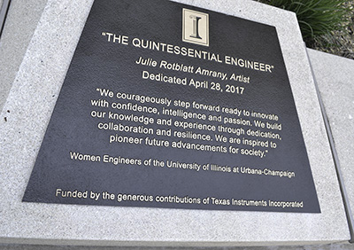 Confident. Passionate. Intelligent. Courageous. Innovative. Resilient. Pioneering. Successful. Inspirational. These character traits describing Illinois’ women engineers are emblazoned on the platforms which support the Quintessential Engineer, Illinois’ newest statue: a female engineer. Unveiled on April 28, 2017, the statue, located just east of MNTL, was four years in the making. While Engineering grad student Sakshi Srivastava is quick to credit Texas Instruments, artist Julie Roblatt Amrany, and the many folks across campus who helped to bring it about, it was Srivastava who first dreamed of a statue to serve as a role model for young women. And it was Srivastava's courage, confidence, and determination (plus a little help from her friends) that helped that dream become a reality.
