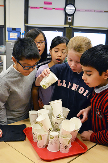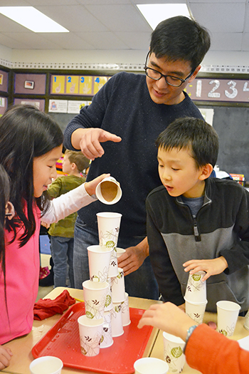 During each of the four sessions, after a brief period of instruction, the kids would tackle a hands-on activity designed to teach them an engineering principle. For example, in the first session, "Blast Off," students made paper rockets. For the "Launcher" activity, the students made popsicle catapults. During the "Make a Litter" activity, they made moving mechanisms; and in the final lesson, "Hot Chocolate Machine," students designed and made one. The idea was for students to build a structure that would channel the hot water poured in the top cup down through a couple of cups containing hot chocolate mix, and by the time the water reached the cups on the bottom—voilà—they would have made hot chocolate automatically! And once the students completed the project, not only did they receive the personal satisfaction of having their design succeed, they all got an even sweeter reward: tasting the fruits of their labor.