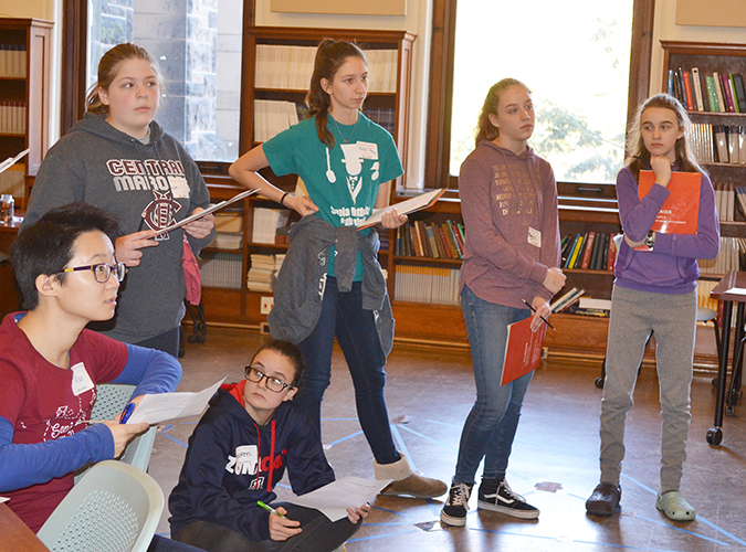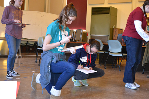 Organized by Dana Neidinger, a math PhD student and AWM Outreach Chair, Sonia Math Day featured not just hands-on activities, but some that had the girls, mostly 8th graders, along with a high school junior and a couple of freshman, up and moving around, in addition to drawing on paper, as they exercised not just their brains but their bodies as well.