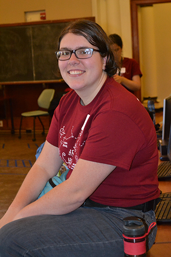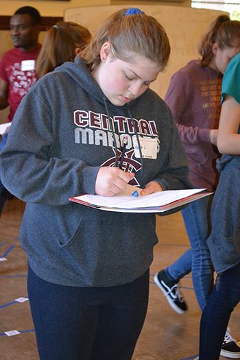 A Central High freshman at Sonia Math Day for the third time enteres data during the "random walk" activity.For another participant, Ellen, a freshman at Central High, it was her third time to participate. She had found a flyer in her school mailbox about the Sonia Math Day and thought, "’Oh, this looks interesting! I think I'll go!’ So I went,” she admits, “and I ended up having lots of fun. It's interactive; it's not boring; they do fun activities.”