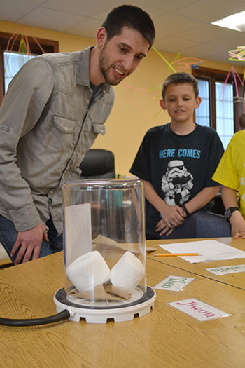 So students were exposed to some weather-related experiments when Haddock and Cornelius used vacuum pumps to remove the air from some bell jars to determine what would happen to different objects placed inside the jars. But first, students received a work sheet, and prior to each experiment, were to develop a hypothesis explaining what they thought would happen in each experiment then report the results on the sheet once the activity was over.