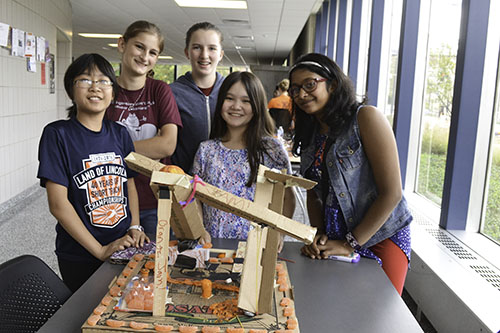 The afternoon consisted of a student panel where Illinois students answered questions from the girls or their parents about anything, followed by the main event of the day, a Batman-and-Robin-themed Rube Goldberg Challenge, which was designed to mostly emphasize mechanical engineering.