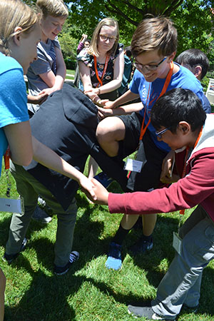 “What is the point of this?!” a middle school student asked several of the 22 Summer Illinois Math (SIM) Camp Epsilon participants during an activity on the first day of week-long day camp which ran from June 10–14th. Tied into a “human knot,” he and several of his fellow campers were trying to get untangled. Here’s how they got in this predicament: they stood in a circle facing each other; each raised their right hand and took the hand of someone across from them, then took another’s hand with their free hand. The goal? To untangle the knot without letting go of each other’s hands, deciding which players should go over, under, backwards, or forwards until they all ended up in a single circle, still holding hands.