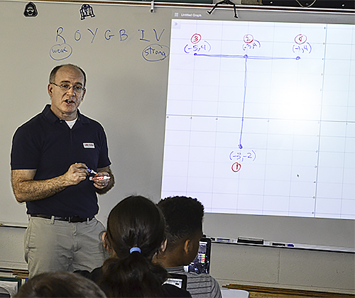 In a fun, exciting way to learn math using cutting-edge technology, on Friday, March 2nd, two of Jason Pound’s 8th grade algebra classes at Urbana Middle School used coordinate math to design a shape which was then displayed using a laser light show. And almost as spectacular as the light show itself was the number of people, both on and off campus, who were involved in various ways to contribute to what MechSE Education Coordinator Joe Muskin calls, “a really cool outreach activity.”