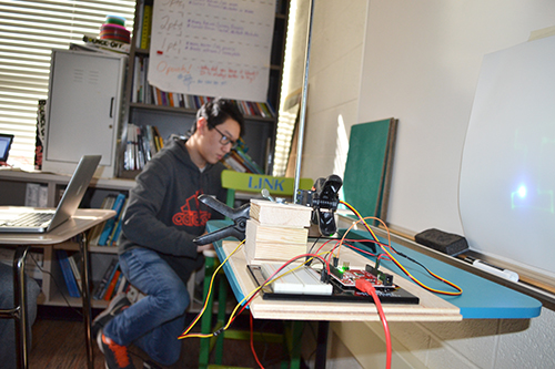 Lu explains how the Arduino program he wrote works. It allows the user to input a set of coordinate points, which are then transferred into another program, which loops through every coordinate and converts them into “positions” for two servo motors. The first motor moves to the positions corresponding to the x coordinates; the second corresponds to the y coordinates. “Since a laser will be reflecting off of mirrors attached to the motors,” Lu explains, “the laser traces the coordinate points as the motors move.”