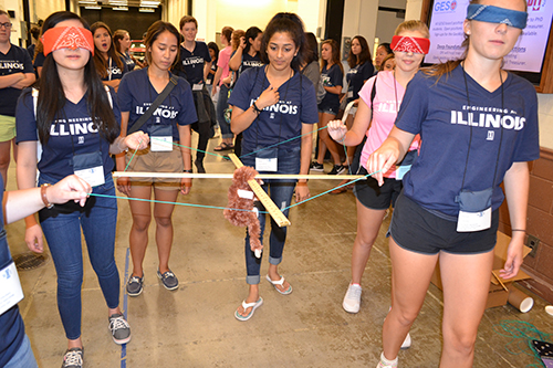 Get familiar with campus. In previous years, a scavenger hunt had helped freshmen become familiar with campus. However, this year, the committee implemented the new-and-improved WIE Olympics. Comprised of team-building activities, the different stations took place in departmental buildings and other key locations around campus. For instance, one activity was in the crane bay of Civil Engineering’s Newmark Lab, so freshmen could experience a giant lab. The Electrical and Computer Engineering Building (ECEB) was the location of the Introductory Session, plus other activities; girls hiked to Loomis Lab, the home of Physics, because most freshmen will take an introductory-level physics course there. In addition, various activities were held in other key locations (the Engineering Building, the Materials Science Building, Illini Union, Grainger Library, etc.). Plus, while competing, the girls were awarded points based on how quickly they finished or how well it was done. The team with the most points received an award.