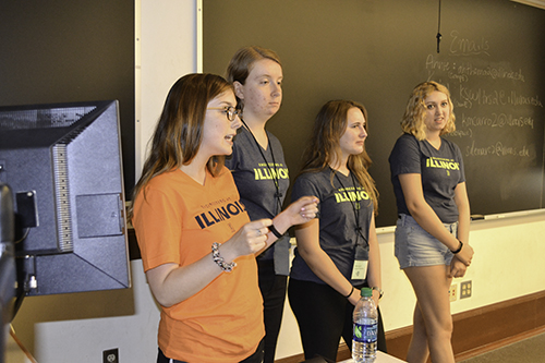 To get the girls more engaged, so they weren’t just sitting there listening to people talk to them the entire time, the student coordinators led the freshmen in an ice breaker. For the Trivial-Pursuit-esque game, the girls signed in to Kahoot, a free, game-based learning platform, responding via their cellphones to ten multiple choice questions about Illinois and WIE, such as, “What year did we start?” and “What is the name of our statue on campus?” Kahoot would then immediately show the response rates so they could see how well they had done compared to the other girls.