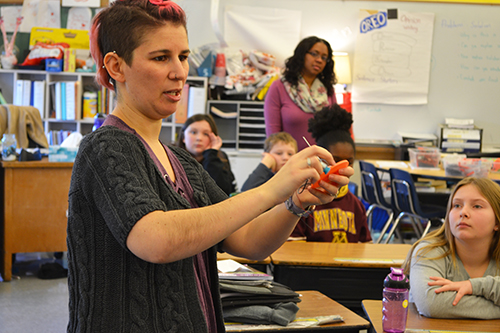 Becerra, who plans on visiting the classroom nine times to lead these activities, shares why she decided to do this project: “I really want to be a STEM outreach coordinator,” she admits, “so this seemed like a fun project to work on.” Becerra recalls chatting with Joe Muskin and learning about the solar car unit he’s been developing. “So I saw how it worked,” she adds, “and I thought we could bring it here.” Natalie designed the unit teaching students about solar and hybrid car technology by pulling together various activities and curricula, including the POETS-developed solar car curriculum.