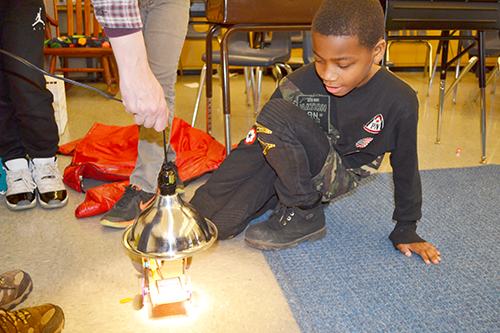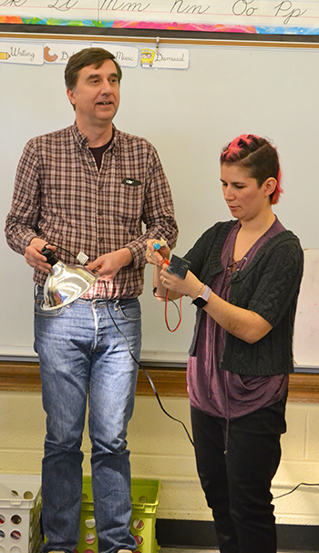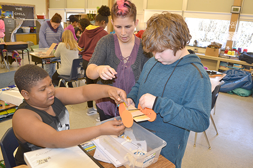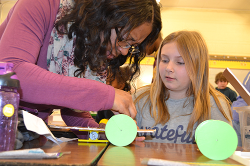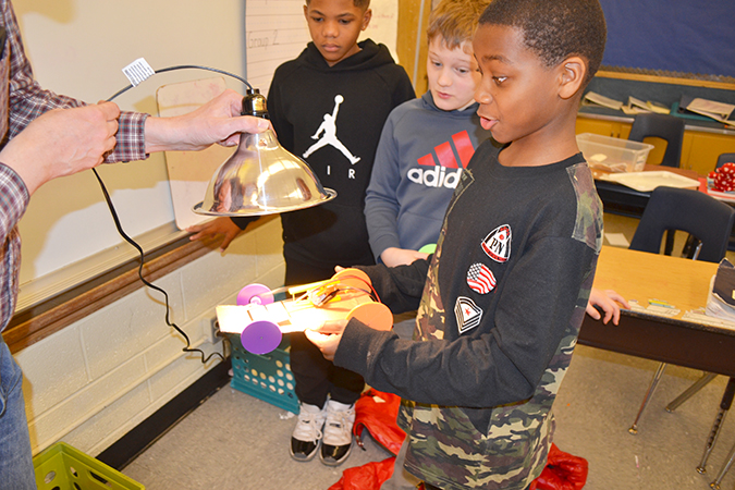 On most Tuesday mornings since the end of January, Tanissa Tutwiler's 5th grade class at Wiley Elementary has been learning some things about mechanical, electrical, even environmental engineering via some cool hands-on projects, including making a solar cell and designing a solar car. The activities were presented by a couple of Illinois staff who are passionate about STEM education: Natalie Becerra, who currently works as Extra Help for the Graduate Office in Academic Affairs, but who dreams of doing STEM outreach permanently, and Joe Muskin, the Education Coordinator of the Mechanical Science and Engineering Department.